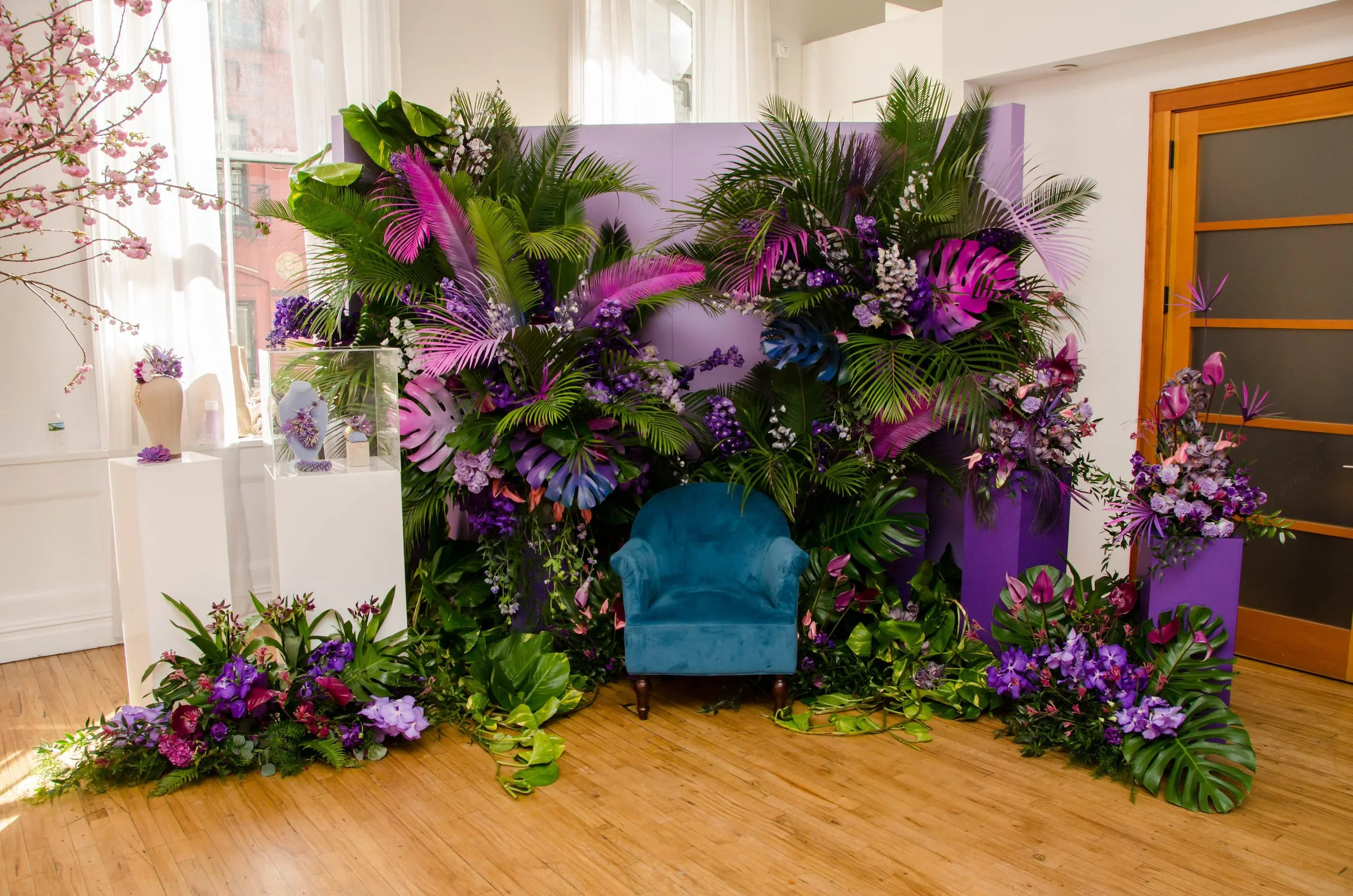 Although each gathering will feature an installation aligned with their brand and event's theme, there are a few design elements that will make any installation stand out. A mix of colors within a similar color palette is essential to bringing an aesthetically cohesive look to an installation. Flowing florals and greenery scaling up a pre-made structure as well as bold and colorful chairs and couches placed in front of an installation will entice guests to pose and share photos.