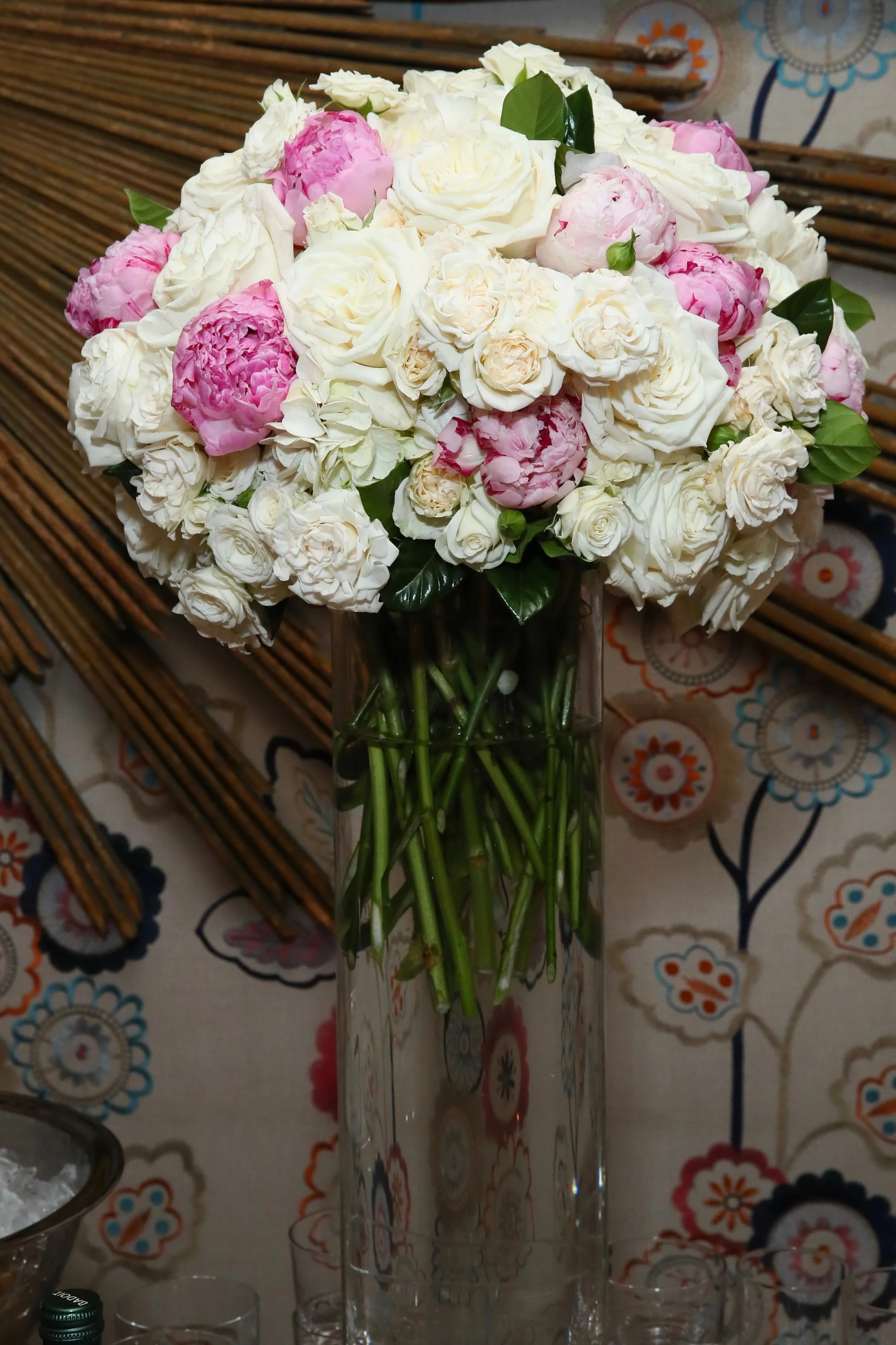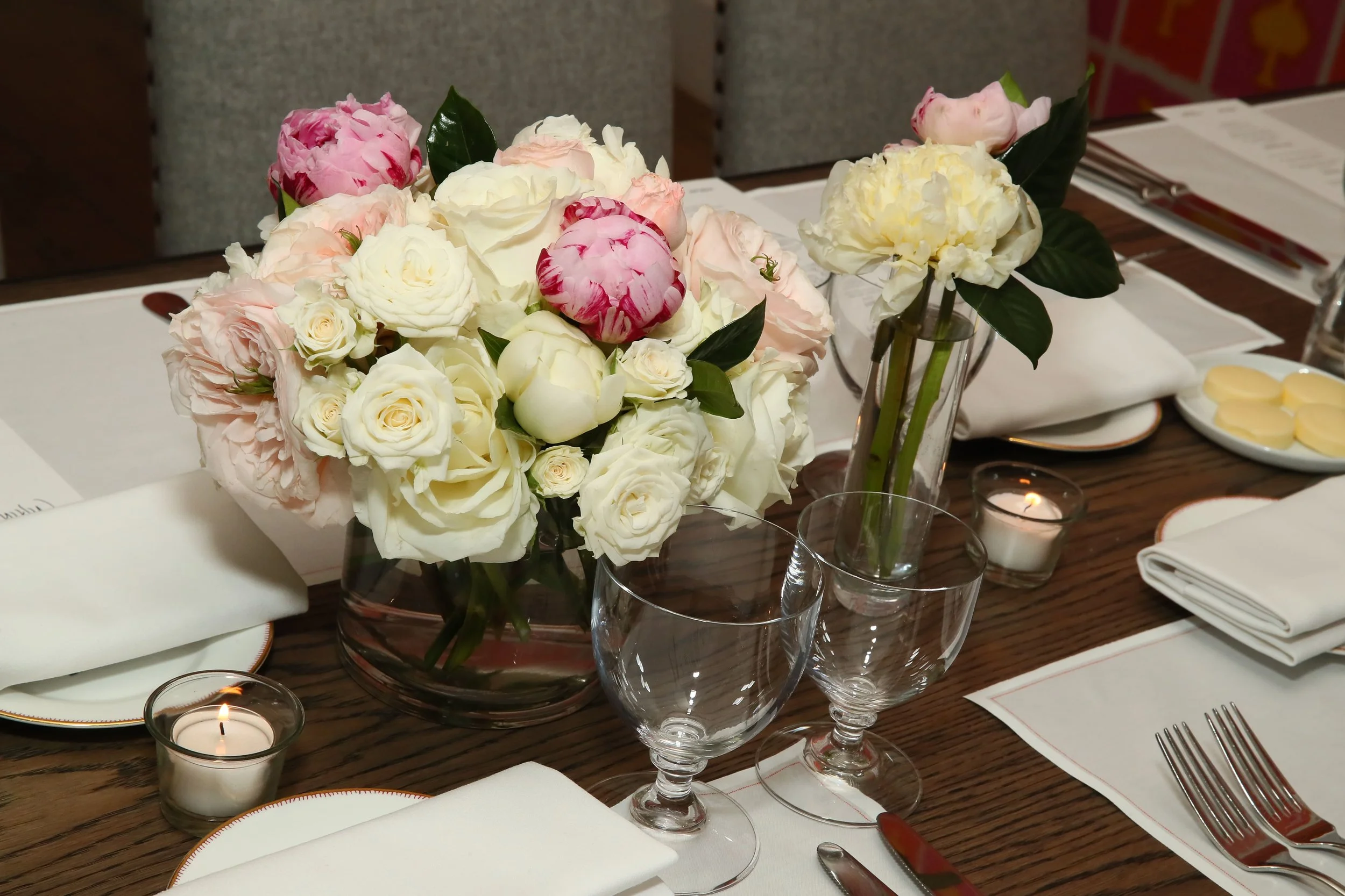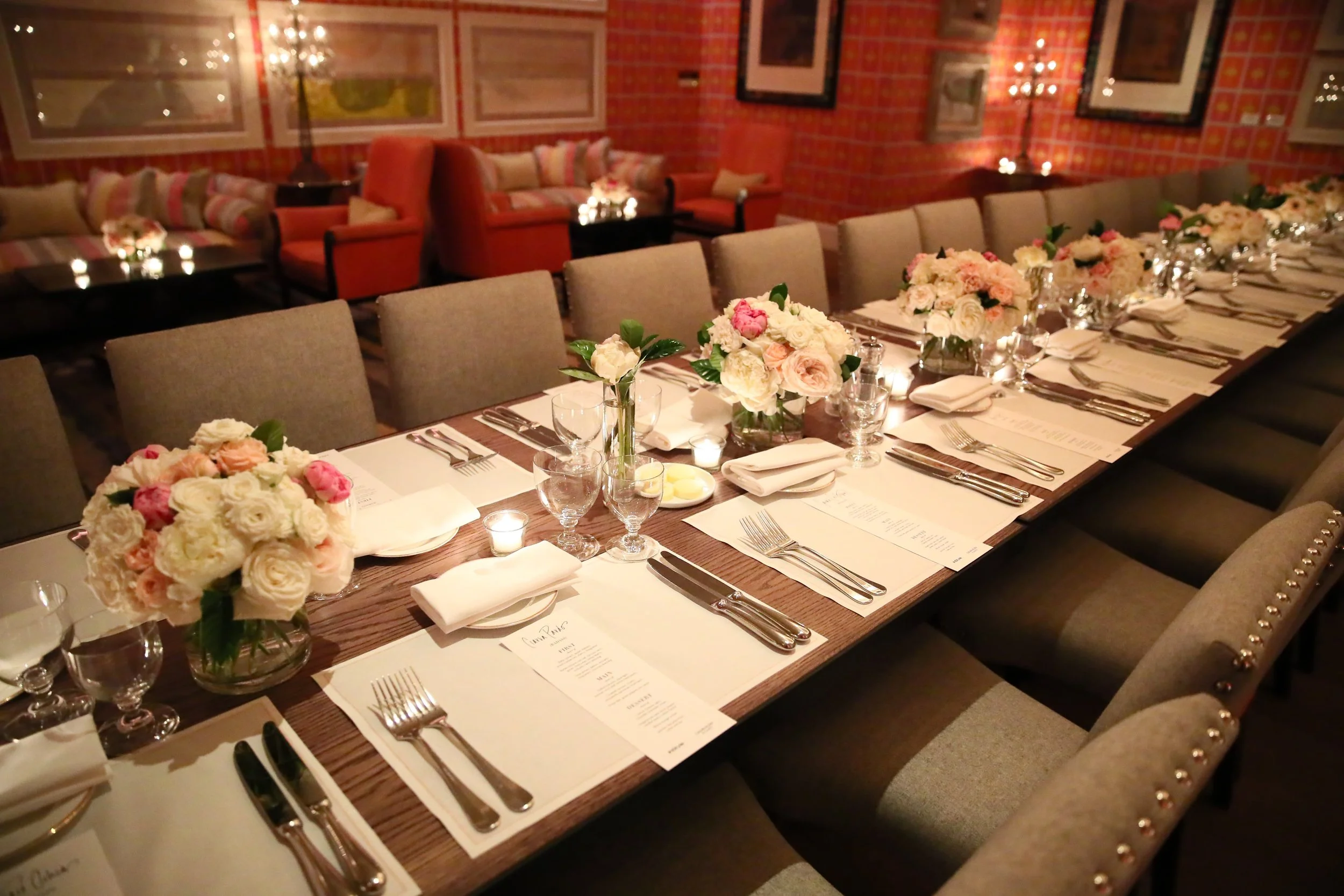 Pale pink and white arrangements lined the dining table at InStyle Magazine’s Badass Women Dinner sponsored by Calvin Klein held at the Crosby Street Hotel on February 2nd.