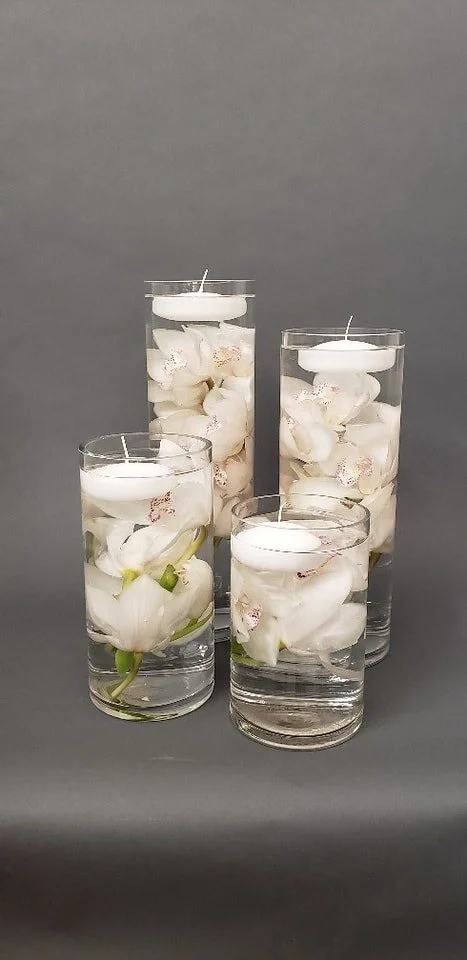 Add a magical ambiance to your tablescape, entryway or any other part of your event space with vessels of floating flowers topped with candles. This display is unique, yet surprisingly easy to make as it only requires a hurricane candle holder, several flower buds and a votive candle. An inexpensive trick to making the candle float is cutting out a small circle of bubble wrap and attaching it to the bottom of the candle! Another option is to purchase floating candles that have the ability to float on their own.